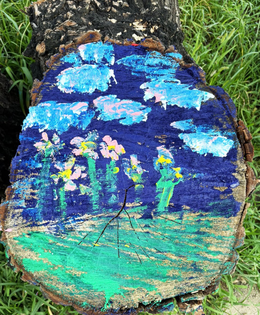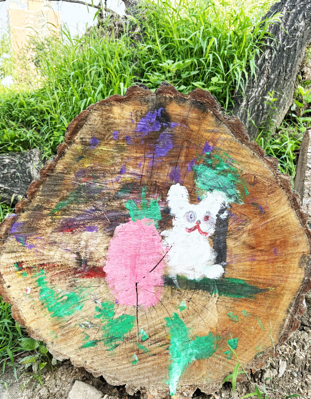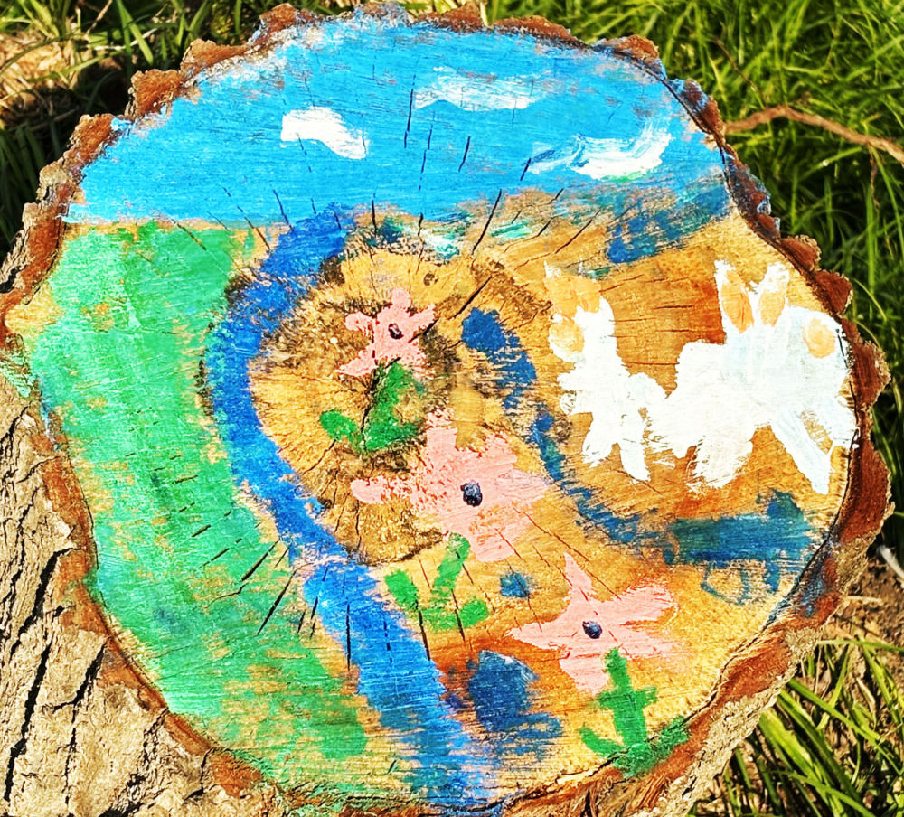 对于不同的地面环境,孩子们有不同的构思。有的树桩截面下是草坪,他们就抹几丛草、描几株花,活脱脱似地上花草长高挡在了截面上。嫩草茂密处是小羊白兔,枝枝杈杈下是小熊松鼠,空旷辽阔处是美丽彩虹……还有更多“抽象派”“印象派”手笔,想要搞明白,你得有丰富想象力。