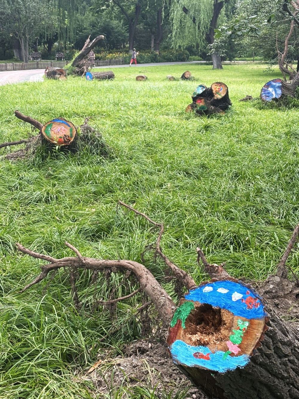 就这样,不久前的一片狼藉,变身为一个倒伏乔木的美术小广场。一度摇头叹息的游人十分惊喜,或忙不迭地用手机拍照,或请人拍摄自己与树桩画的合影。有的把照片发到微信群、朋友圈,有的干脆呼朋唤友一起来观看,还指指点点感慨:“理念一变,废物变宝,坏事变好”“大树倒了也能变漂亮!不要怕挫折”……见闻着这些场景,我和同伴们忽若有了些“网红”的感觉。
