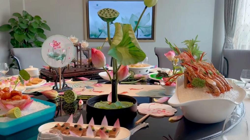 游客在嘉兴还可以品尝到精美的运河“荷花宴”。嘉兴的一家餐厅以荷花入馔、莲藕为材,主打菜品“长虹卧波”以当地地标大运河长虹桥为灵感,用荷叶包裹鱼肉蒸制,兼具视觉美感与江南风味。