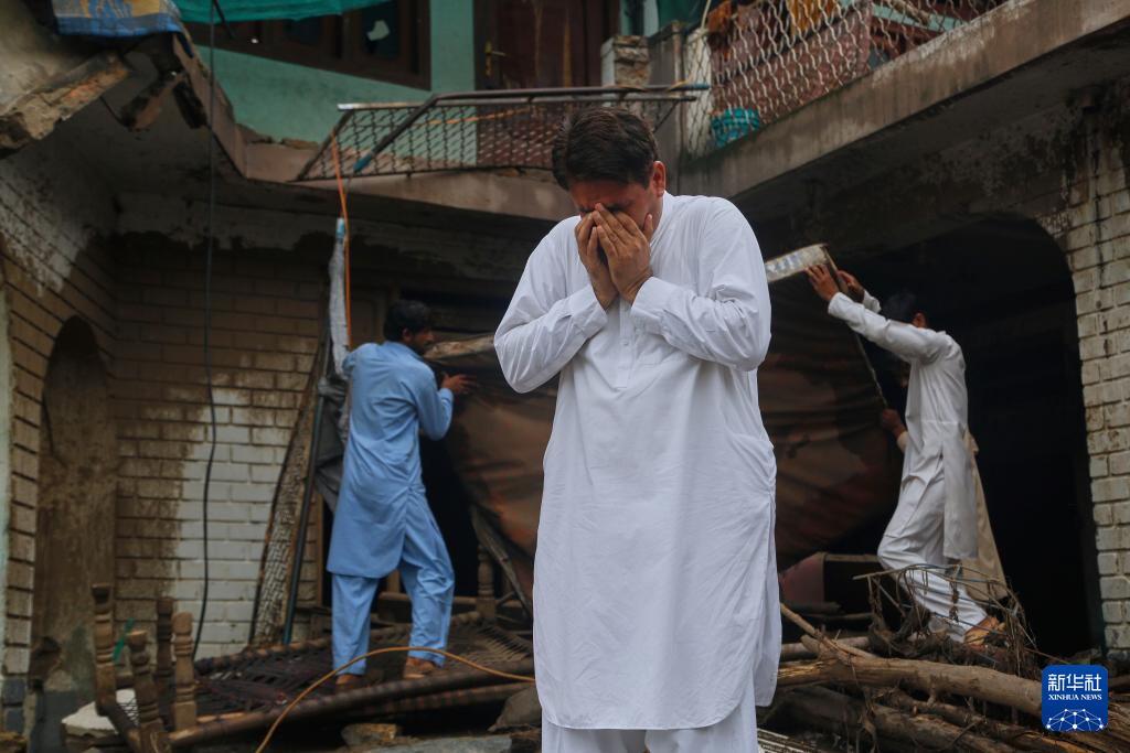 8月17日,在巴基斯坦开伯尔-普什图省布内尔地区一处被洪水损坏的房屋前,当地居民难掩悲伤情绪。 新华社/美联