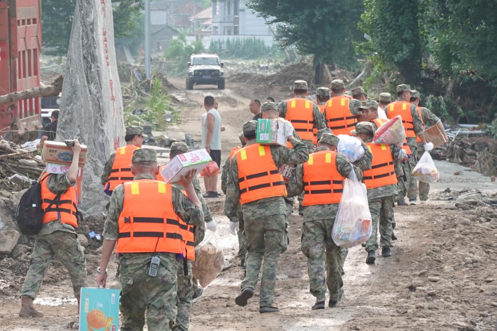 7月28日,救援人员在徒步奔赴受灾村庄。新华社记者 范世辉 摄