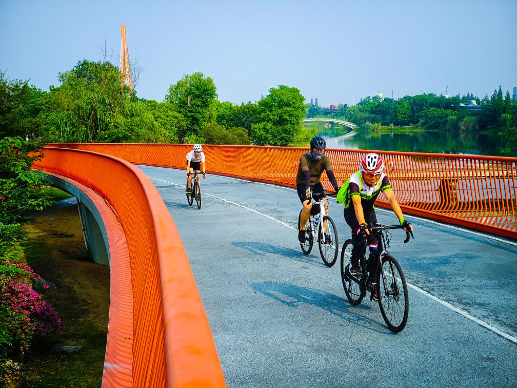 人们在成都锦城湖公园绿道上骑行(2023年摄)。新华社记者 沈伯韩 摄