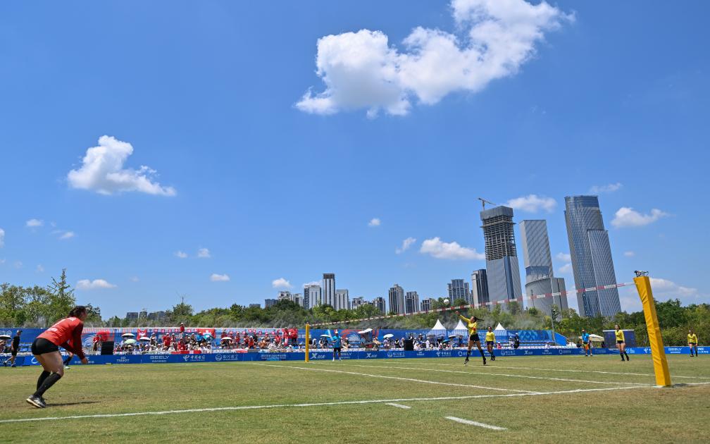 8月12日,巴西队与奥地利队在2025年成都世运会浮士德球女子半决赛比赛中。新华社记者 陈诚 摄