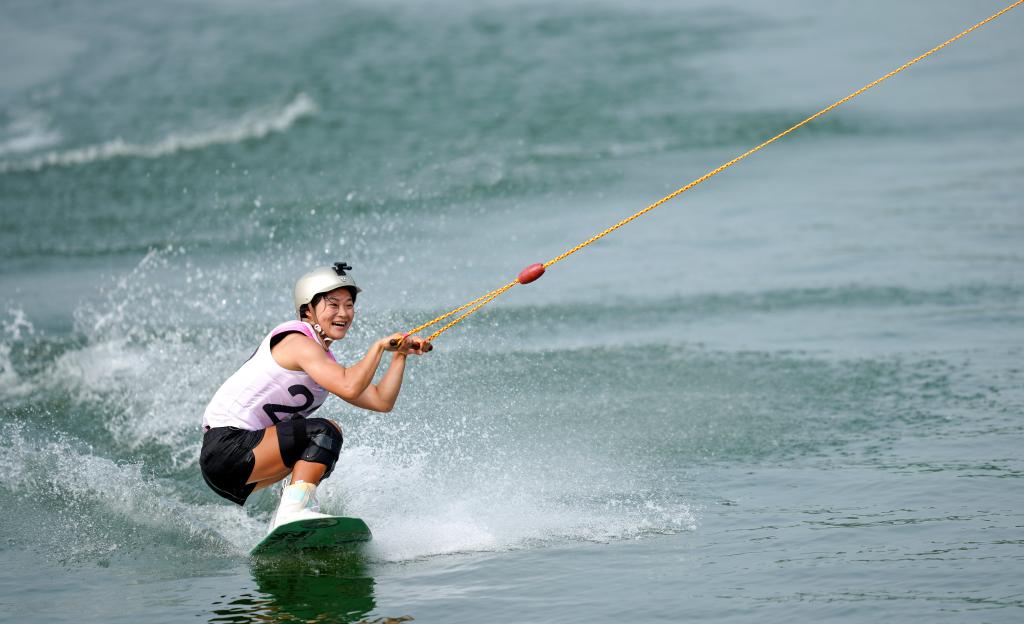 8月8日,2025年成都世运会索道滑水资格赛在三岔湖桃花岛赛场举行,图为中国选手徐露在女子资格赛中。新华社记者 贝赫 摄