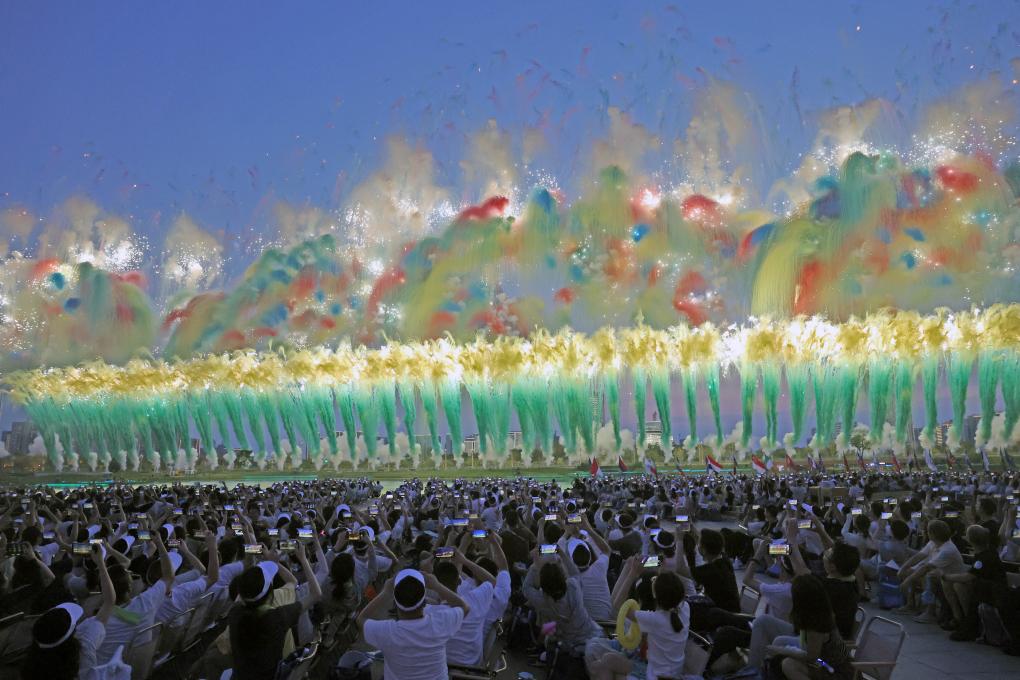 8月7日,观众在开幕式上用手机拍摄焰火表演。新华社记者 陈斌 摄