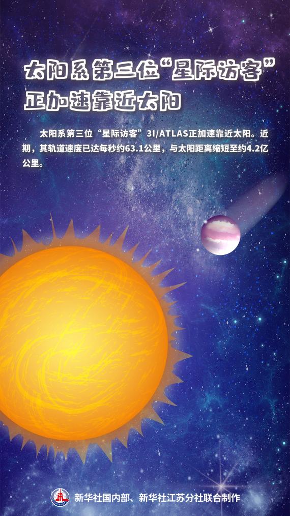新华社南京8月21日电(记者王珏玢、朱筱)太阳系第三位“星际访客”3I/ATLAS正加速靠近太阳。这颗7月初穿过木星轨道时被发现的系外天体,自发现以来就持续吸引着全球天文学家和爱好者的目光。据最新观测,它将于10月29日前后经过近日点,此后逐渐远离太阳系,最终重返太阳系外的星际空间。