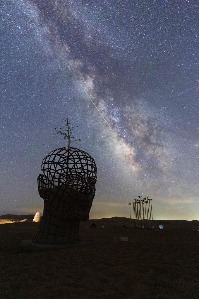 2025年8月13日,在甘肃民勤沙漠雕塑公园拍摄的银河与流星同框。(戴建峰 摄)