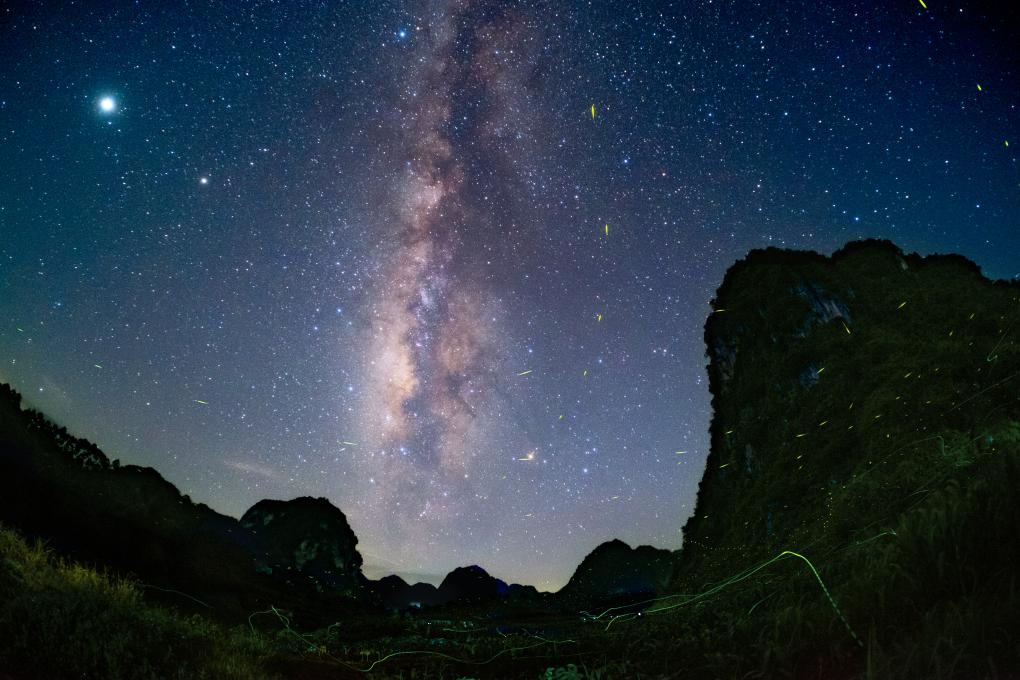 2021年8月31日,在广西南宁市隆安县拍摄的银河与飞舞的萤火虫。(王晋 摄)