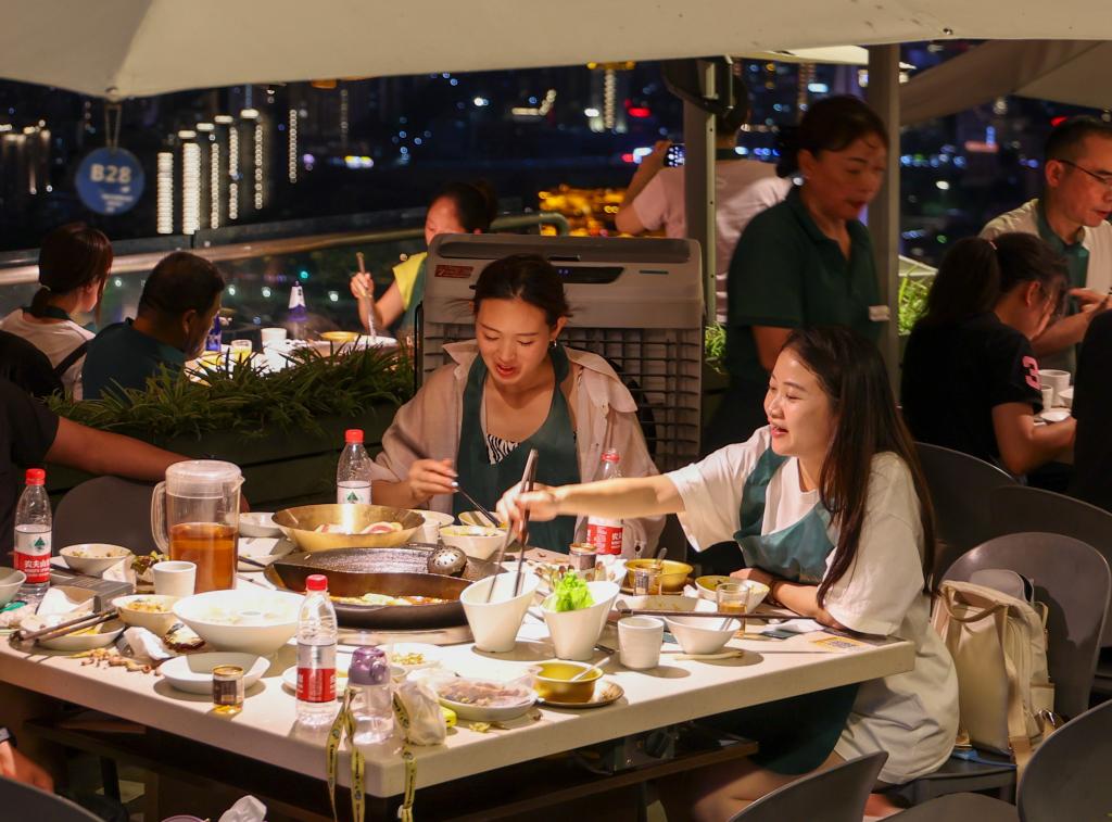 重庆南岸区南山风景区内一家网红火锅店内,游客们在品尝特色美食——重庆火锅。刘潺 摄