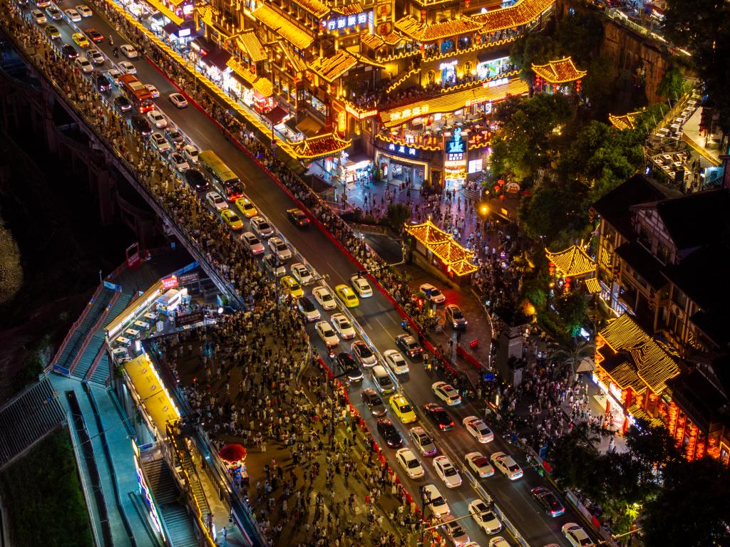 图为重庆洪崖洞景区。连日来,重庆持续高温天气,当地旅游热度依然不减,夜间客流更旺。刘潺 摄