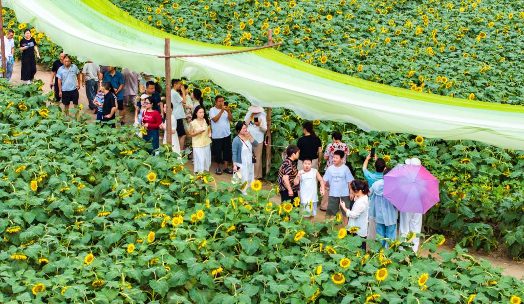 8月12日,游客在河南省驻马店市西平县老王坡产业融合发展示范区的百亩油葵花海游玩。新华社发(赵永涛摄)