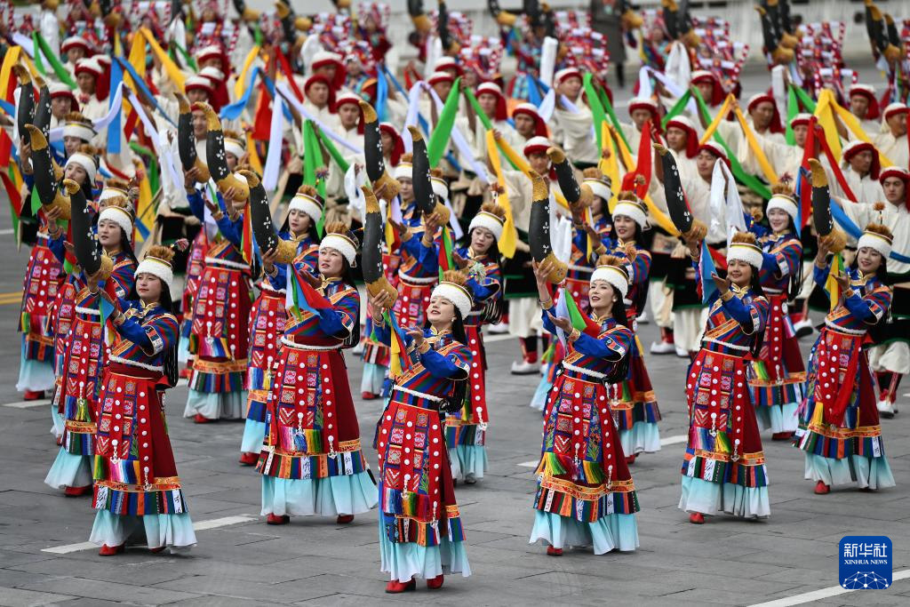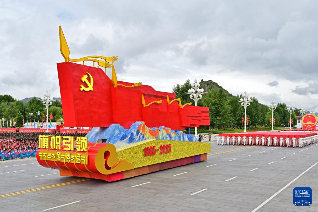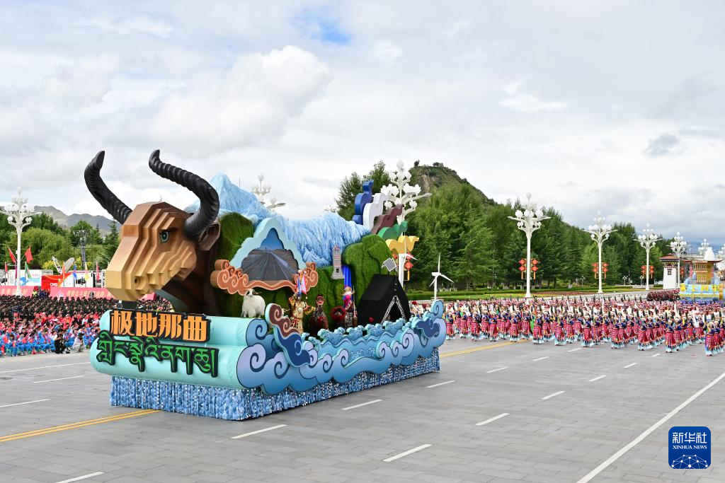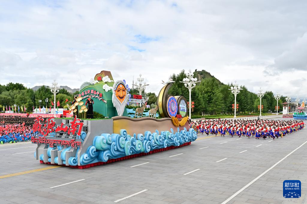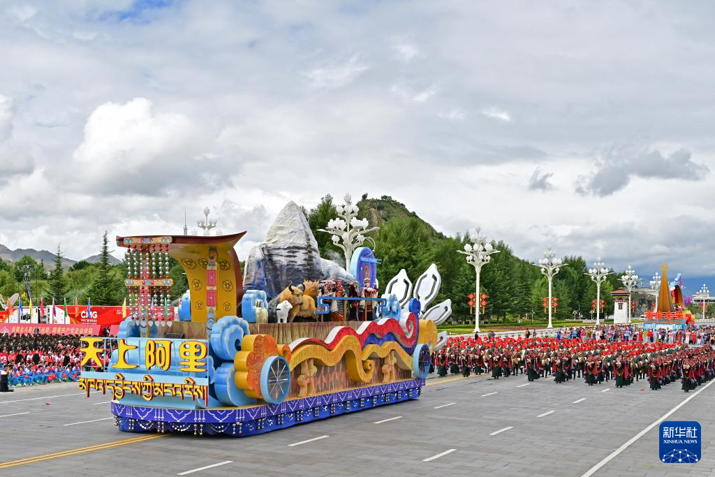 8月21日上午,西藏各族各界干部群众约2万人欢聚拉萨市布达拉宫广场,热烈庆祝西藏自治区成立60周年。这是游行的彩车通过布达拉宫广场。