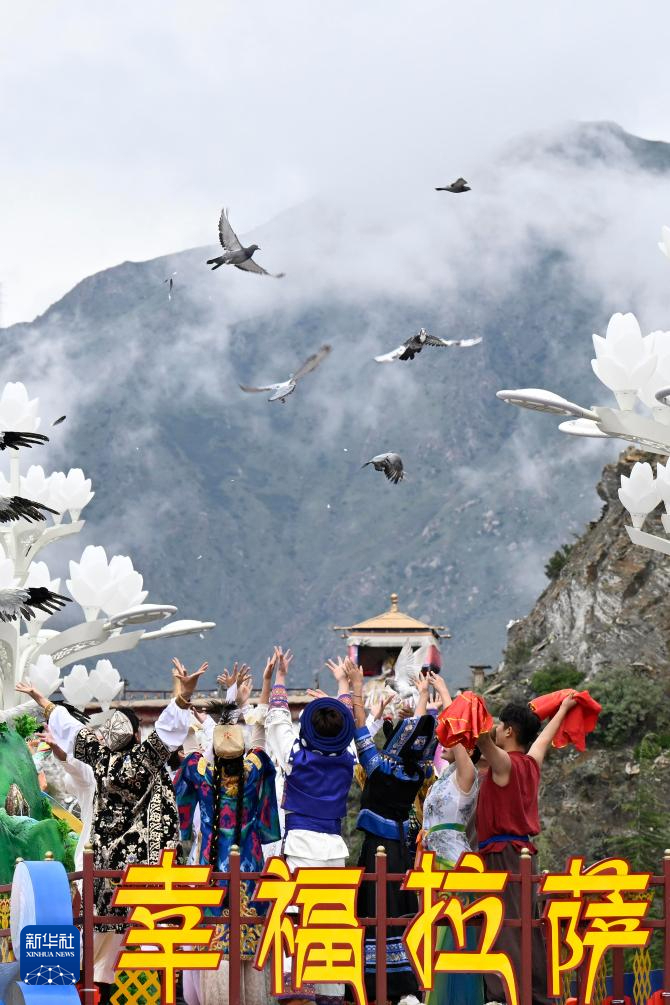 8月21日上午,西藏各族各界干部群众约2万人欢聚拉萨市布达拉宫广场,热烈庆祝西藏自治区成立60周年。这是彩车上的演员通过布达拉宫广场时放飞鸽子。