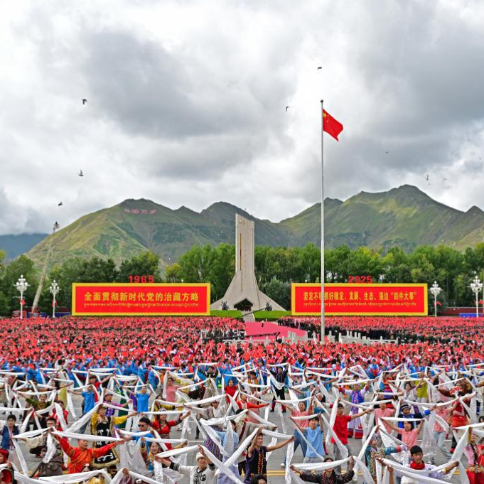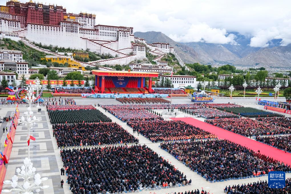 8月21日上午,西藏各族各界干部群众约2万人欢聚拉萨市布达拉宫广场,热烈庆祝西藏自治区成立60周年。这是庆祝大会现场。