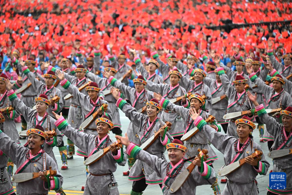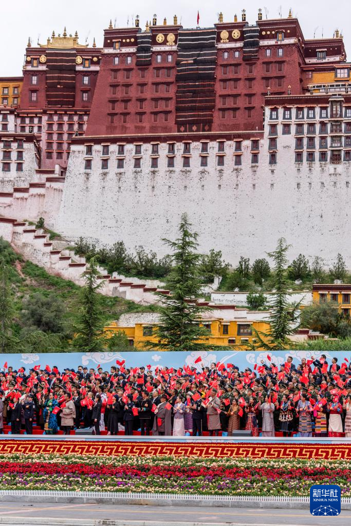 8月21日上午,西藏各族各界干部群众约2万人欢聚拉萨市布达拉宫广场,热烈庆祝西藏自治区成立60周年。这是群众在庆祝大会现场合影。