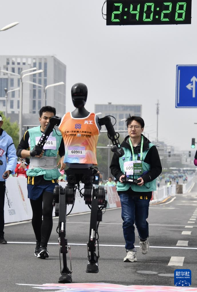天工机器人在北京亦庄举行的人形机器人半程马拉松赛上夺得第一名(4月19日摄)。新华社记者 李欣 摄