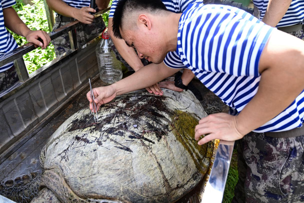 深夜,某岛礁一级上士邢伟杰在沙滩边缘巡逻时,听到一阵声响。循着声音的方向找去,邢伟杰发现了一只被渔网紧紧缠住的海龟。邢伟杰立刻通过对讲机向连队报告。很快,几名战友带着工具赶来。大家围在受伤海龟身边,眼神中满是心疼。经过近一个小时努力,他们从渔网中解救出被困海龟,随后又一点一点为海龟清理藤壶,海龟被顺利放归大海。