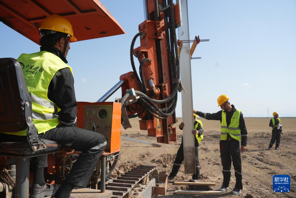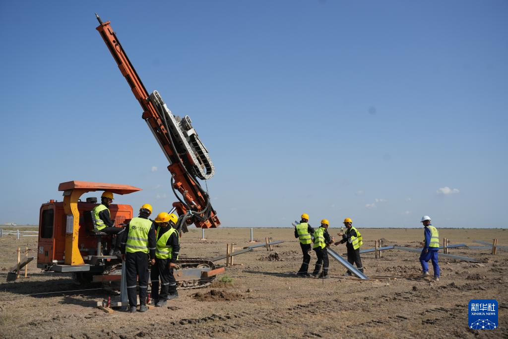 骄阳无遮,黄土飞扬。零星灌木点缀的空旷工地上,蓝顶白墙的活动板房格外醒目,银灰色钢桩整齐排列,头戴黄色安全帽的工人正驾驶钻机作业。在阿塞拜疆东南部的比利亚苏瓦尔区,中国企业正在建设该国装机容量最大的光伏电站项目——比利亚苏瓦尔445兆瓦光伏电站项目。
