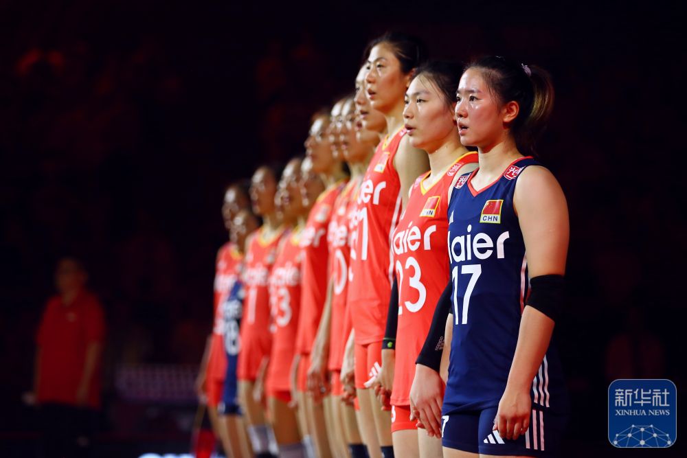 ↑8月23日,中国队球员在赛前奏唱国歌仪式上。新华社记者 孙玮彤 摄