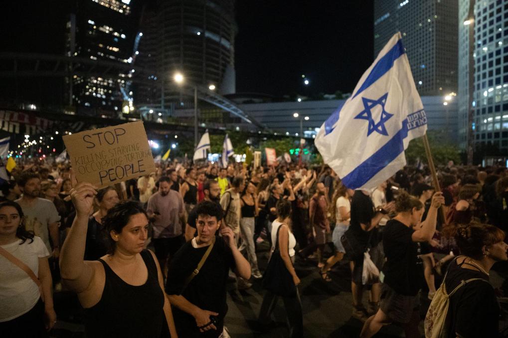 8月17日晚,人们在以色列中部城市特拉维夫的以色列国防部大楼附近参加游行示威活动。新华社记者陈君清摄