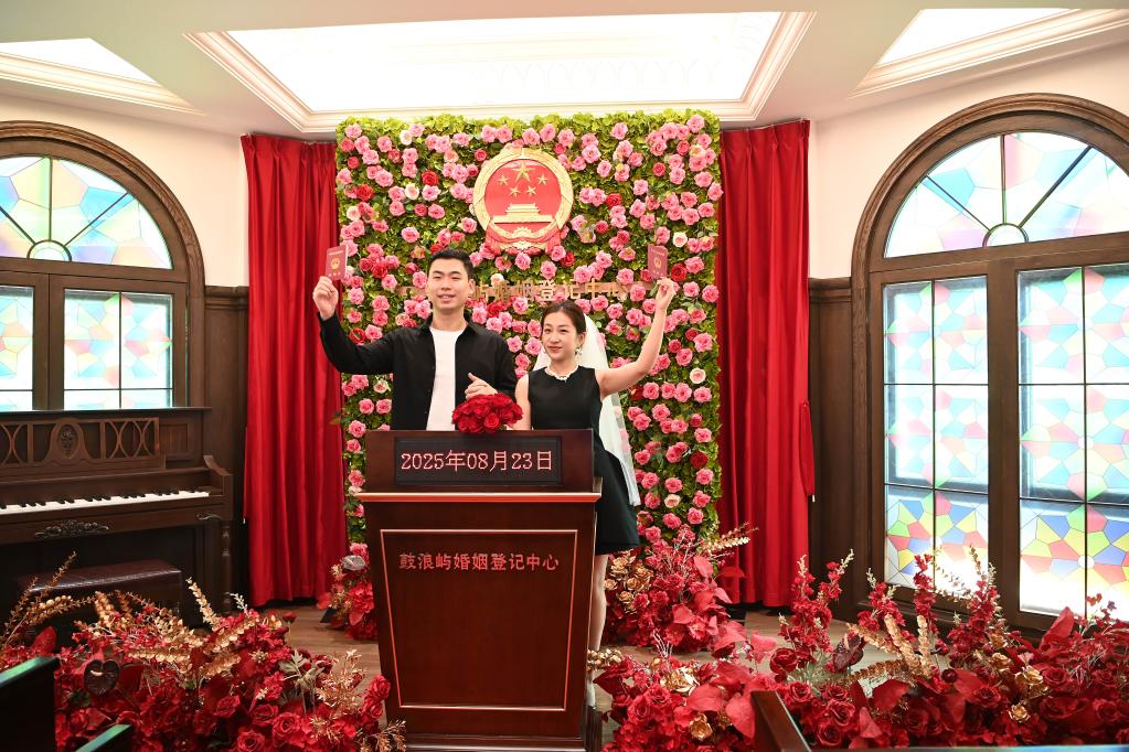 8月23日,一对新人在鼓浪屿婚姻登记中心拍照留念。