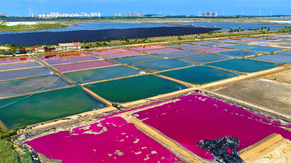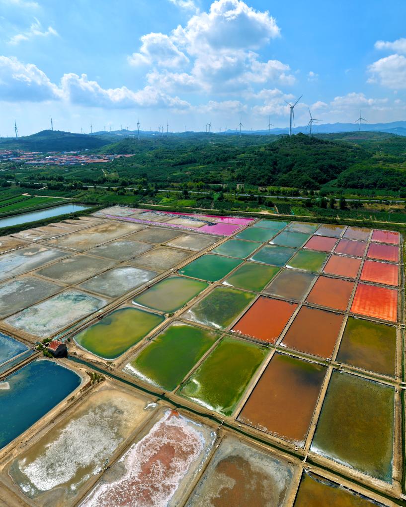 初秋时节,山东省荣成市一处盐田在阳光下呈现出五颜六色的景象,宛如大自然的“调色盘”,美不胜收。