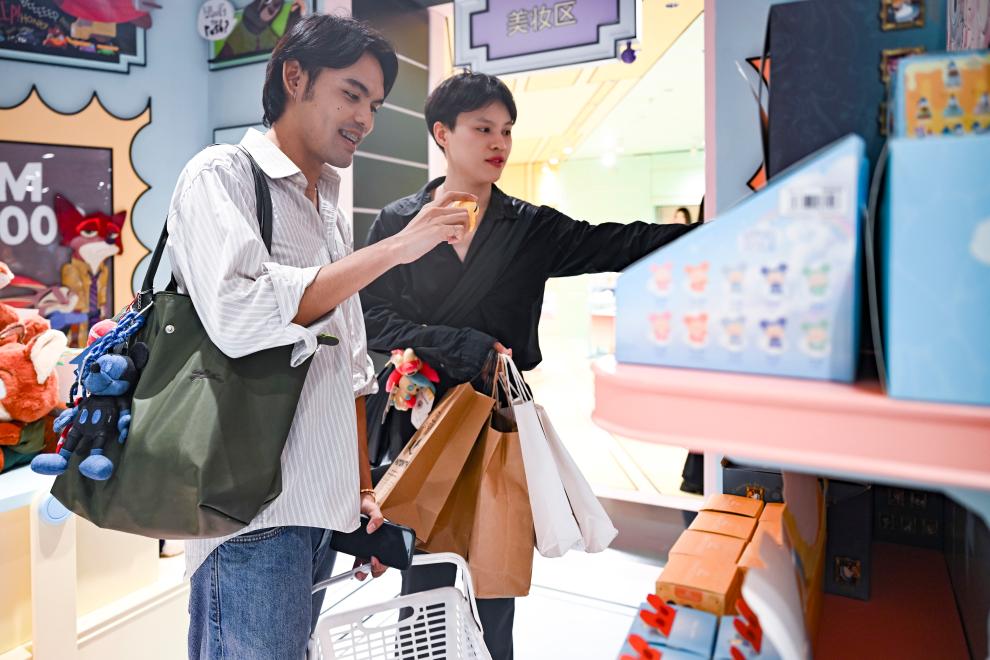 7月17日,两名泰国游客在位于上海市南京路步行街的一家潮玩店里挑选商品。新华社记者 陈浩明 摄