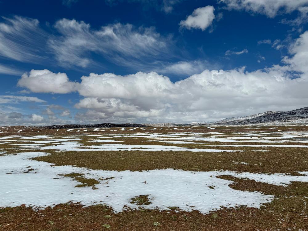 数个小时前,刚经历过一场大雪的可可西里,如今已脱下了银装素裹的大衣,乌云也消散殆尽,湛蓝的天空和触手可及的云团,仿佛要把渺小的我们包裹进这漫无边际的油画中。