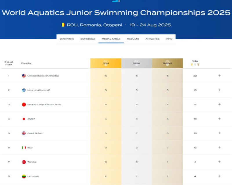 世界青年游泳锦标赛奖牌榜。世界泳联官网截图