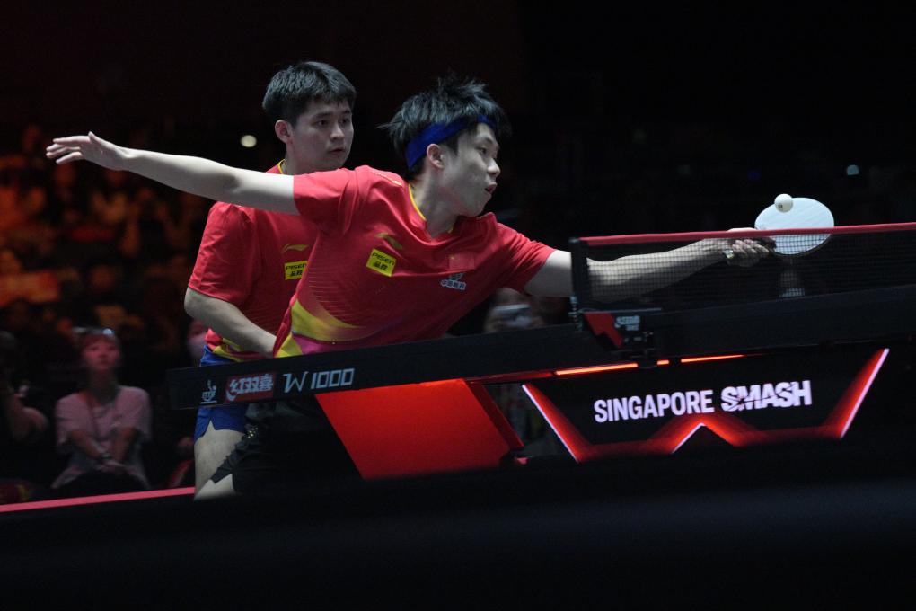 2月8日,王楚钦(前)/林诗栋在比赛中。当日,在世界乒乓球职业大联盟(WTT)新加坡大满贯男双决赛中,王楚钦/林诗栋3比0战胜中国台北组合林昀儒/高承睿,夺得冠军。新华社发(邓智炜摄)