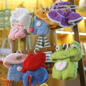 这些“娃衣”出自桐乡市一家已经开了20多年的老牌服装厂,走进厂区二楼的“多巴胺毛线屋”,各种毛线玩偶、包包琳琅满目,“娃衣”更是款式各异,背带裤、上衣、裙子应有尽有。