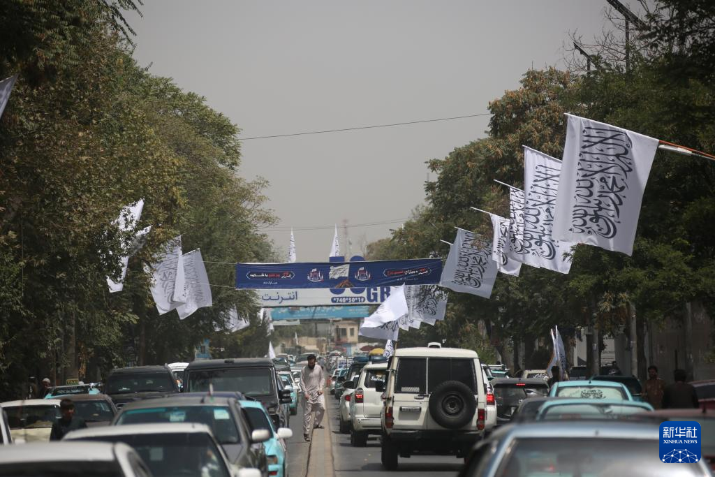 8月15日,阿富汗喀布尔一条大街上悬挂着代表阿临时政府的旗帜。新华社发(塞夫拉赫曼·萨菲摄)