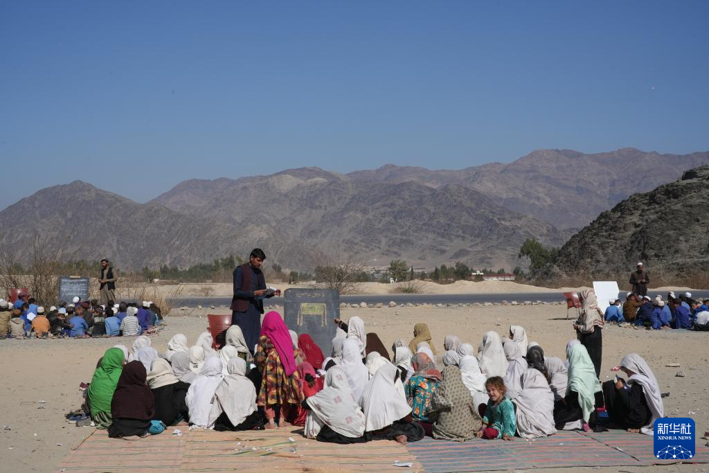 2月12日,在位于阿富汗东部楠格哈尔省贾拉拉巴德市附近的路边学校,女孩子们席地而坐听课。新华社记者 李昂 摄