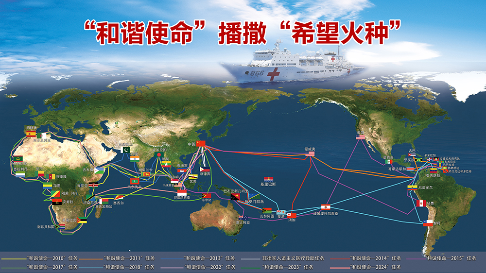 张晓刚:2010年以来,“和平方舟”号医院船高扬仁爱之帆,先后10次执行“和谐使命”任务,航程32万余海里,遍及3大洋6大洲,到访52个国家和地区,提供37万余人次医疗服务,用大爱仁心播撒“希望火种”,与到访国民众结下深厚情谊。今后,中国海军将继续执行“和谐使命”任务,用更多的“生命之舟”提供高质量公共安全产品,续写践行全球安全倡议、服务构建海洋命运共同体的温暖篇章。