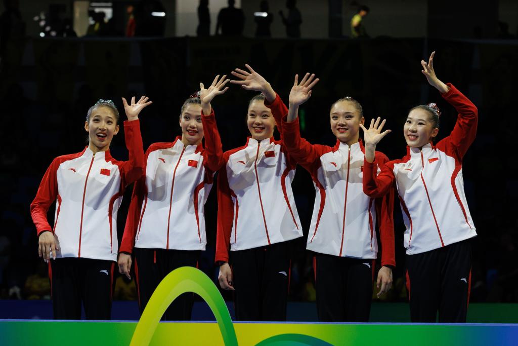 8月24日,中国队选手在颁奖仪式上。当日,在巴西里约热内卢举行的2025年国际体操联合会艺术体操世界锦标赛集体5带决赛中,中国队获得冠军。新华社发(克劳迪娅·马尔提尼摄)