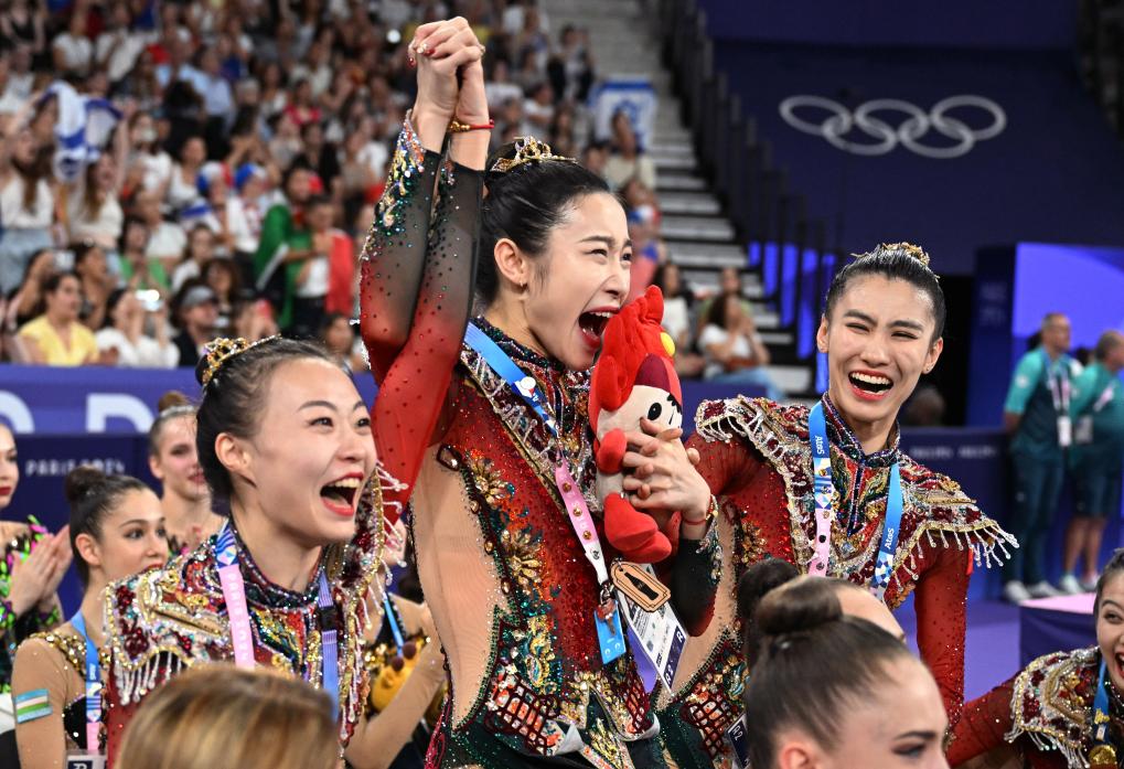 2024年8月10日,中国队欢呼庆祝。当日,在巴黎奥运会艺术体操项目集体全能决赛中,中国队获得冠军。新华社记者 程敏 摄
