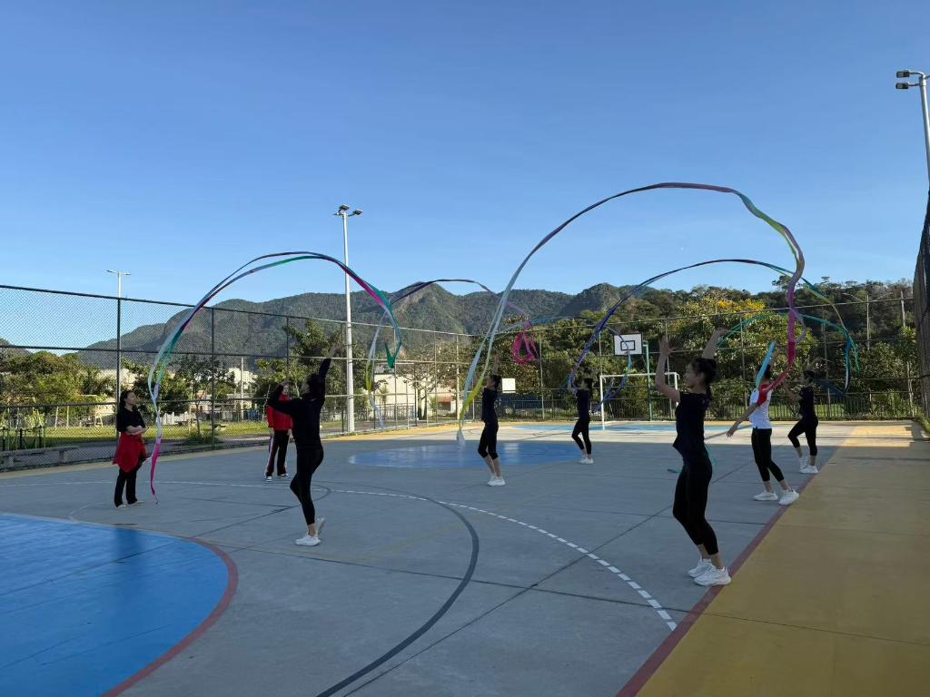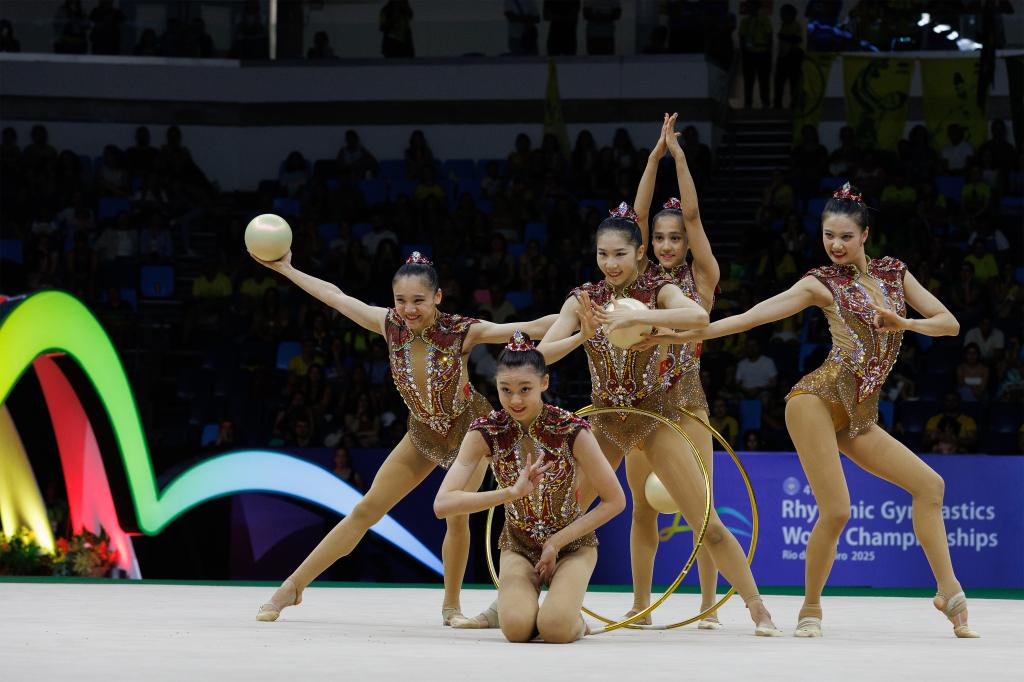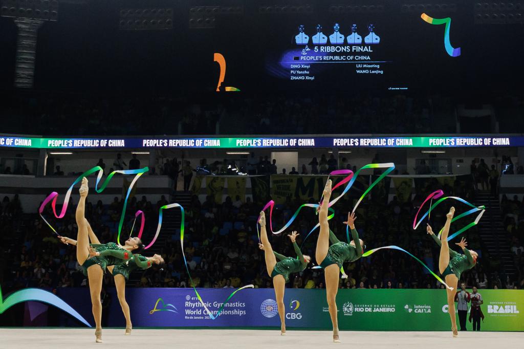 8月24日,中国队选手在比赛中。当日,在巴西里约热内卢举行的2025年国际体操联合会艺术体操世界锦标赛集体5带决赛中,中国队获得冠军。新华社发(克劳迪娅·马尔提尼摄)