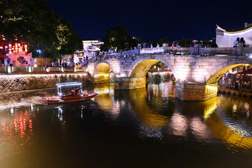 8月10日,市民游客在福州上下杭历史文化街区的三捷河的三通桥上休憩游玩。