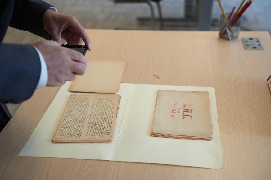这是8月21日在位于英国曼彻斯特市的人民历史博物馆拍摄的由曾参加东江纵队的新华社伦敦分社首任社长黄作梅主笔编撰的东江纵队援救盟军人员的档案资料。新华社记者吴黎明摄