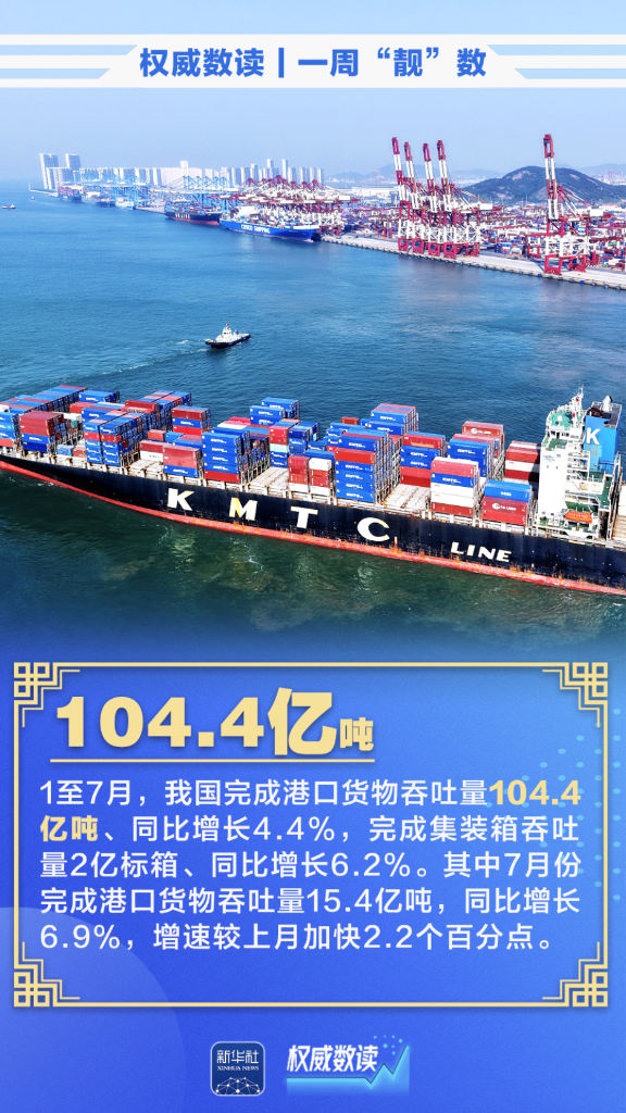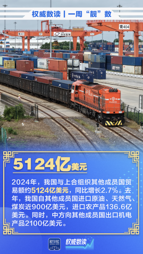 2024年,我国与上合组织其他成员国贸易额约5124亿美元,同比增长2.7%;今年1至7月,我国跨区域人员流动量达394.6亿人次;前7个月,我国完成港口货物吞吐量104.4亿吨、同比增长4.4%……本周这些数据,最值得关注!