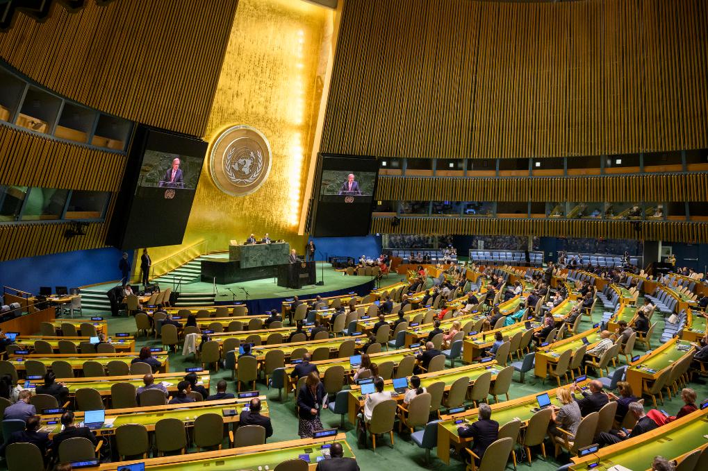 这是6月26日在位于纽约的联合国总部拍摄的联合国大会纪念联合国宪章签署80周年的非正式全体会议现场。新华社发(联合国供图/洛伊·费利佩摄)