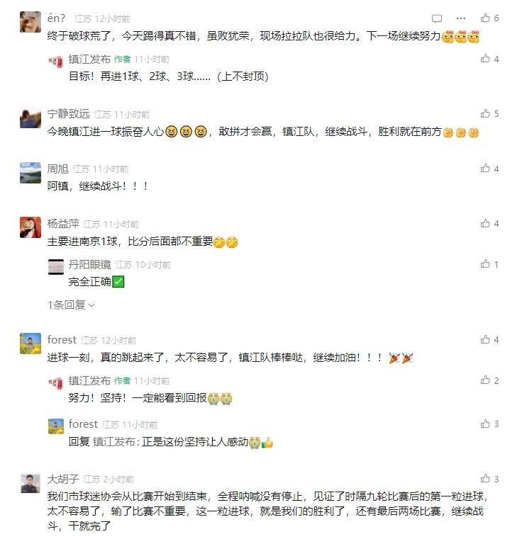 苏州队客场1:2不敌南通队后,网友在苏州发布的留言一片点赞和鼓励。