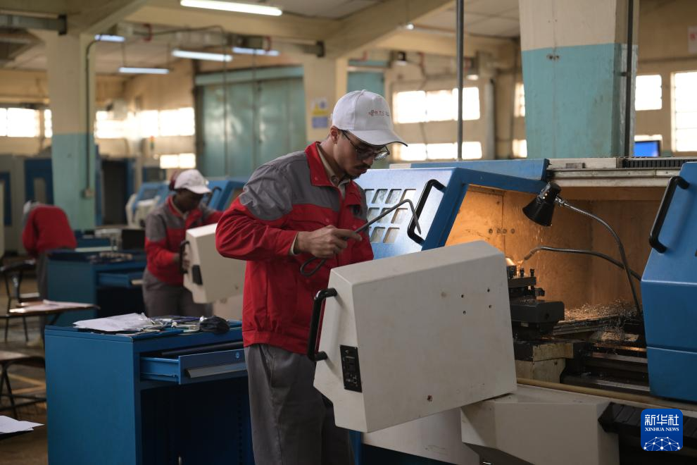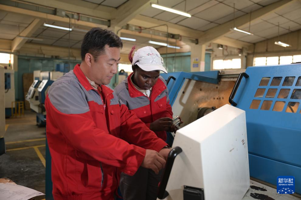 8月29日,在位于肯尼亚首都内罗毕的肯尼亚科技大学,中方指导老师与第十届非洲职业技能挑战赛的参赛选手在数控车床前交流。新华社记者 杨光 摄