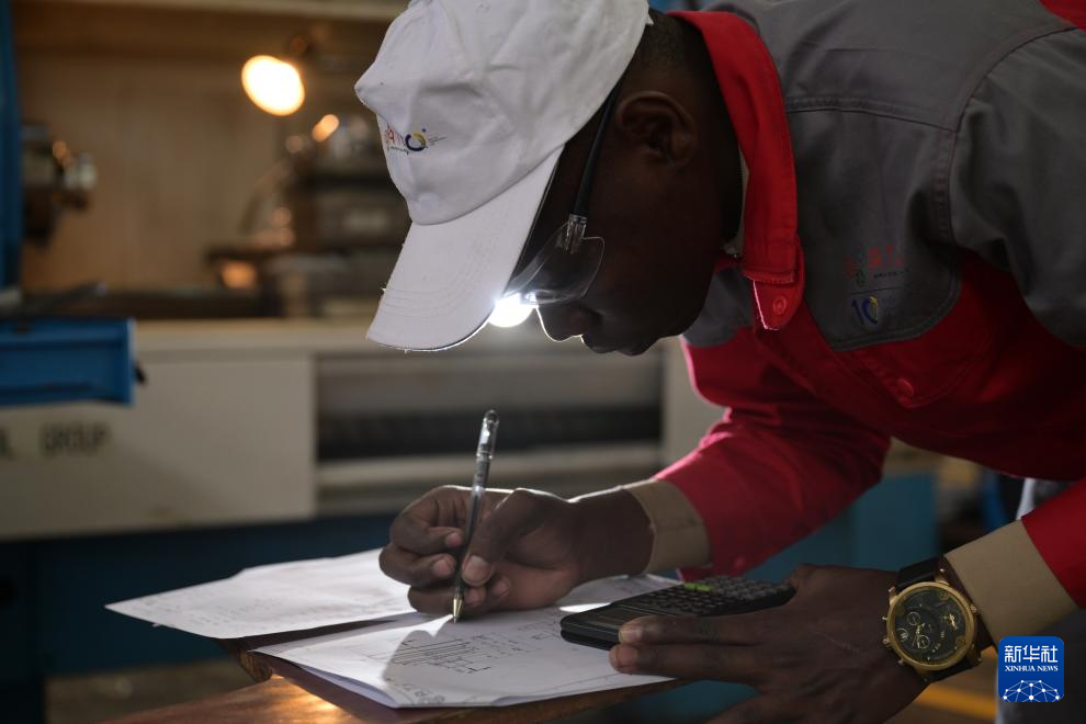 8月29日,在位于肯尼亚首都内罗毕的肯尼亚科技大学,一名第十届非洲职业技能挑战赛的参赛选手在数控机床前进行计算。新华社记者 杨光 摄