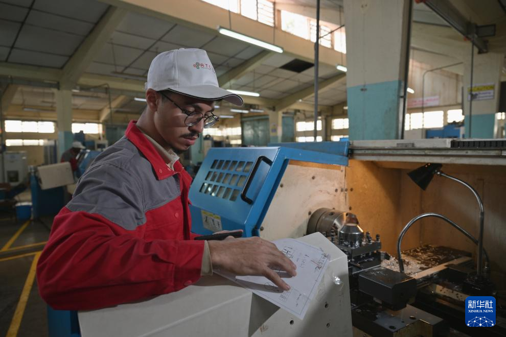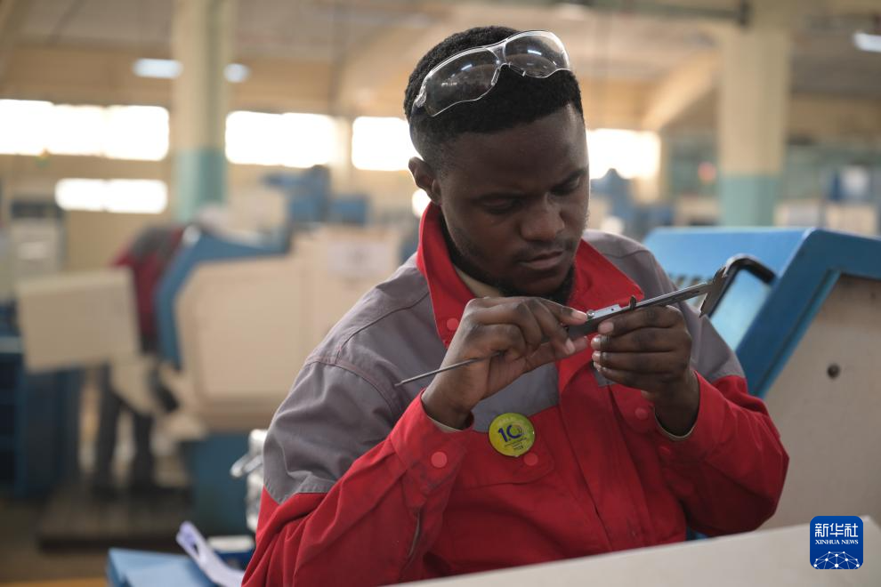 8月29日,在位于肯尼亚首都内罗毕的肯尼亚科技大学,一名第十届非洲职业技能挑战赛的参赛选手在数控机床前检查游标卡尺。新华社记者 杨光 摄