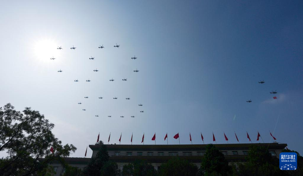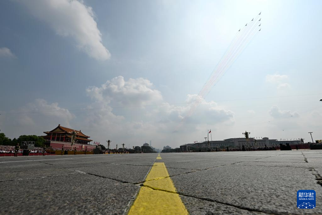 9月3日,纪念中国人民抗日战争暨世界反法西斯战争胜利80周年大会在北京隆重举行。这是空中梯队飞过天安门广场上空。