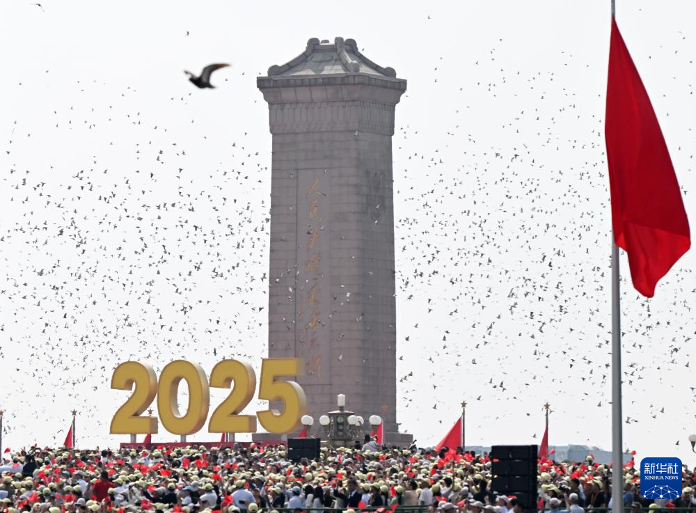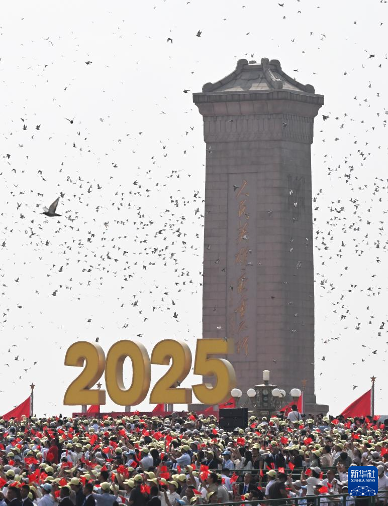 9月3日,纪念中国人民抗日战争暨世界反法西斯战争胜利80周年大会在北京隆重举行。这是纪念大会现场放飞和平鸽。