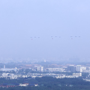 9月3日,纪念中国人民抗日战争暨世界反法西斯战争胜利80周年大会在北京隆重举行。这是空中护旗梯队。