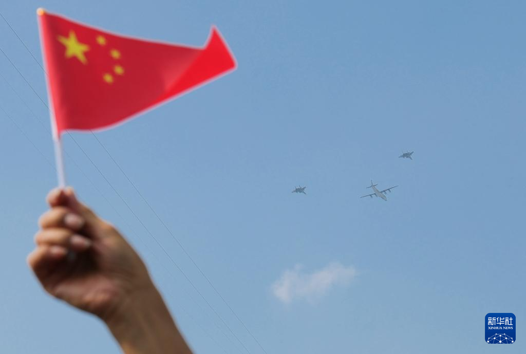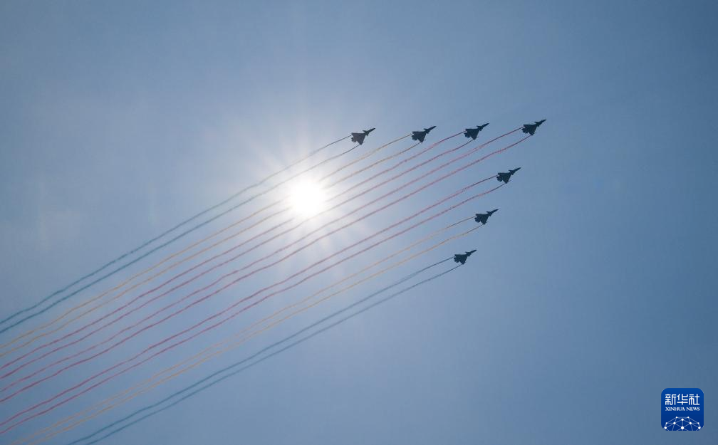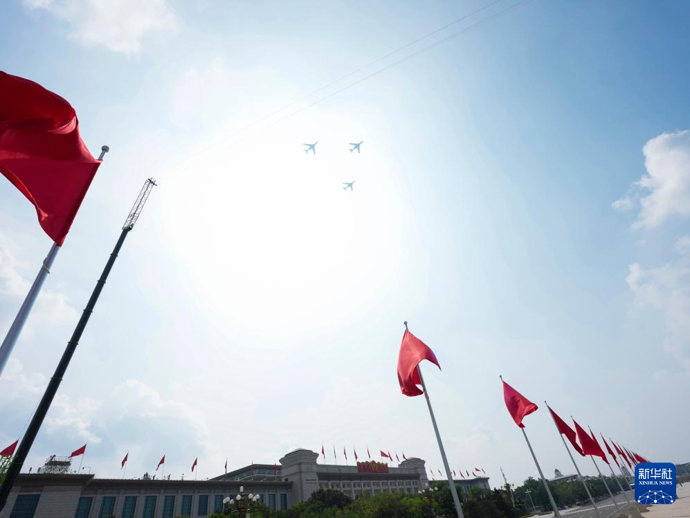 9月3日,纪念中国人民抗日战争暨世界反法西斯战争胜利80周年大会在北京隆重举行。这是空中护旗梯队。