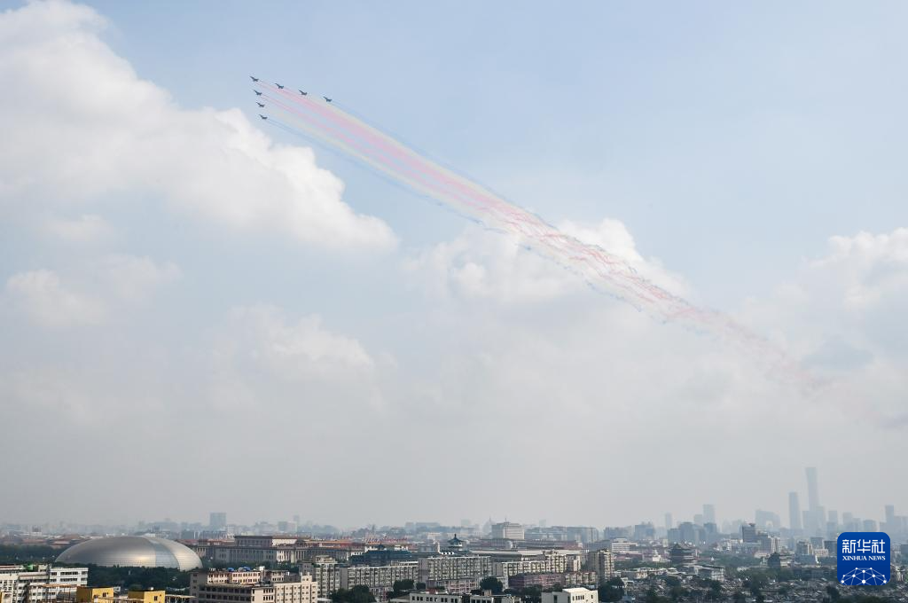 9月3日,纪念中国人民抗日战争暨世界反法西斯战争胜利80周年大会在北京隆重举行。这是教练机梯队通过天安门广场。
